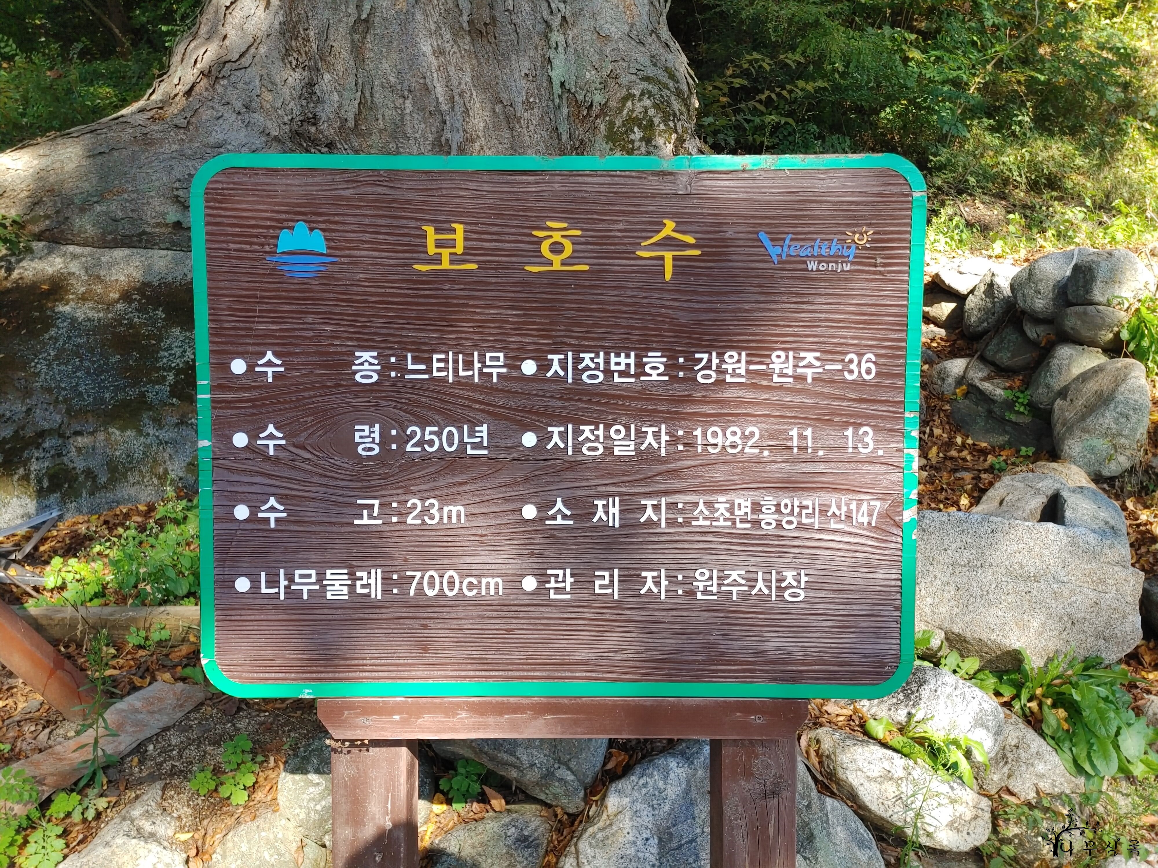 오래 살다 보니 차마 챙기지 못하는 것도 많습니다. 자신의 나이는 잊은 지 오래여서 얼토당토않은 250년이라는 수명을 안내판으로 달고 있고, 내가 다리를 뻗은 곳이 바위인지 흙인지도 모르며, 수더분하게 자란 머리숱은 쳐 줄 사람조차 없었습니다. 하지만 5년 전과 비교하니 훨씬 깔끔한 모습이긴 합니다. 사람 때문에 수명이 깎이기도 하지만, 오래 산 생명을 지켜주는 것 역시 사람 덕분일지도 모릅니다. 원주시 소초면 흥양리 직산 소재.