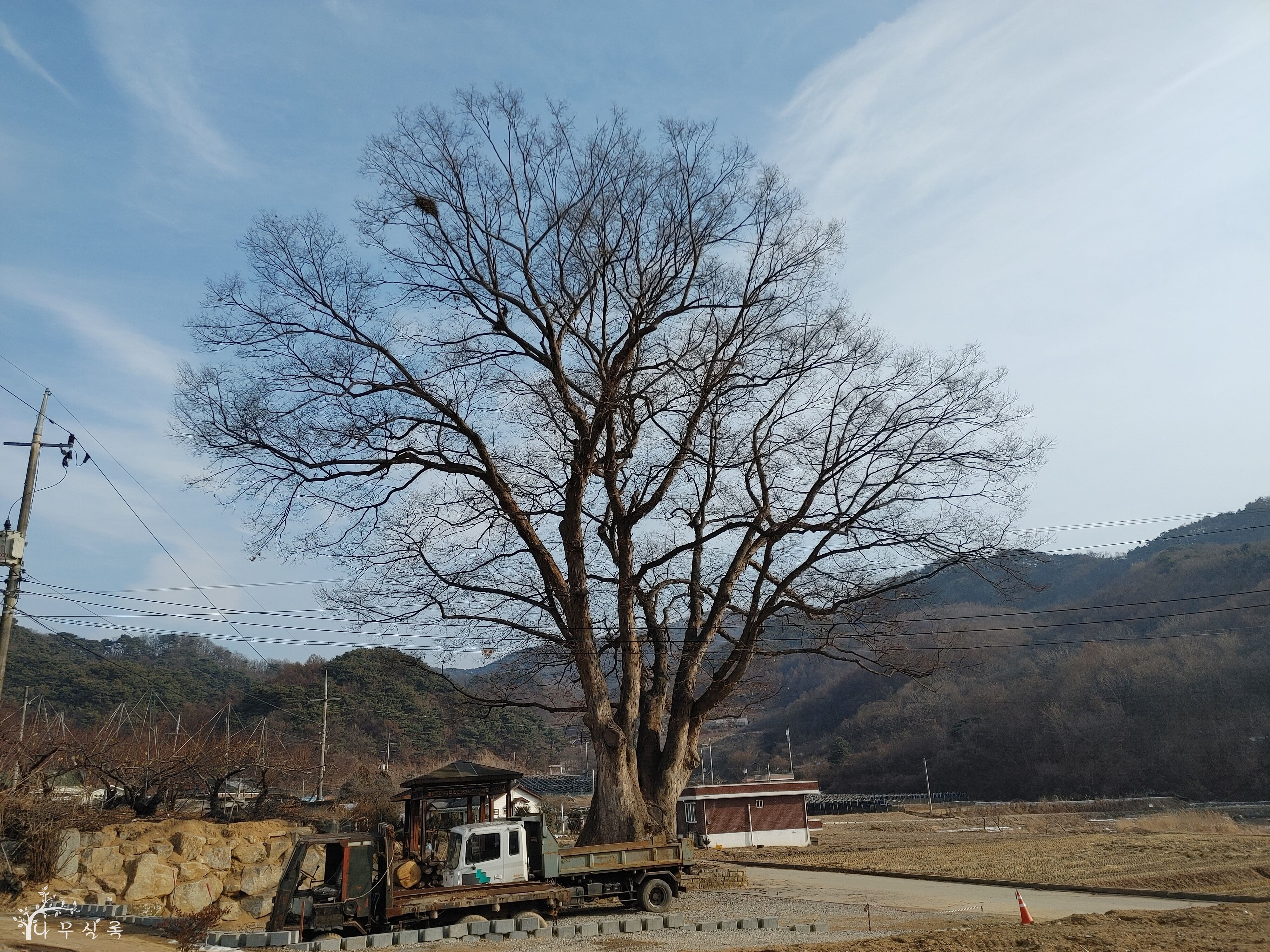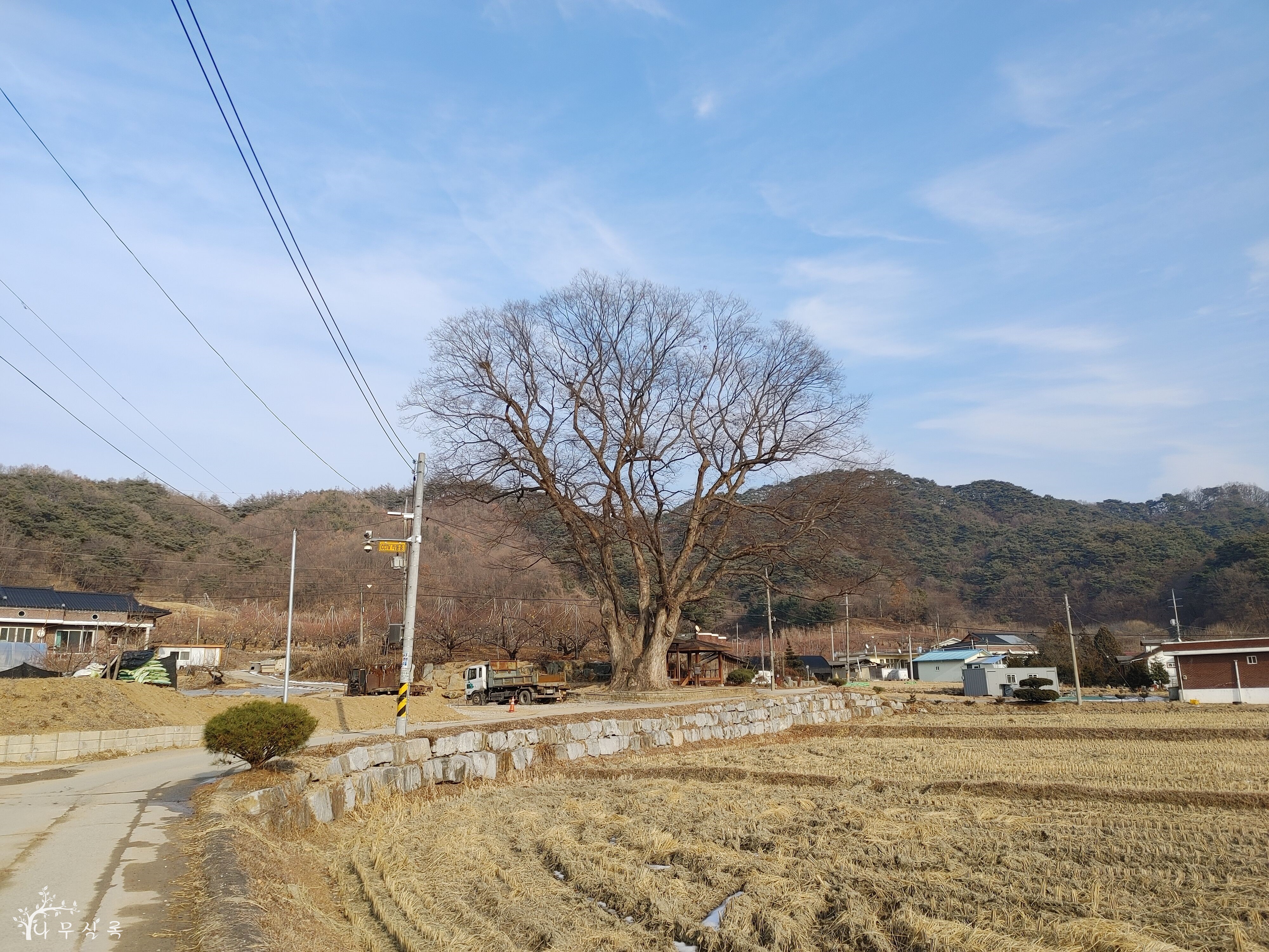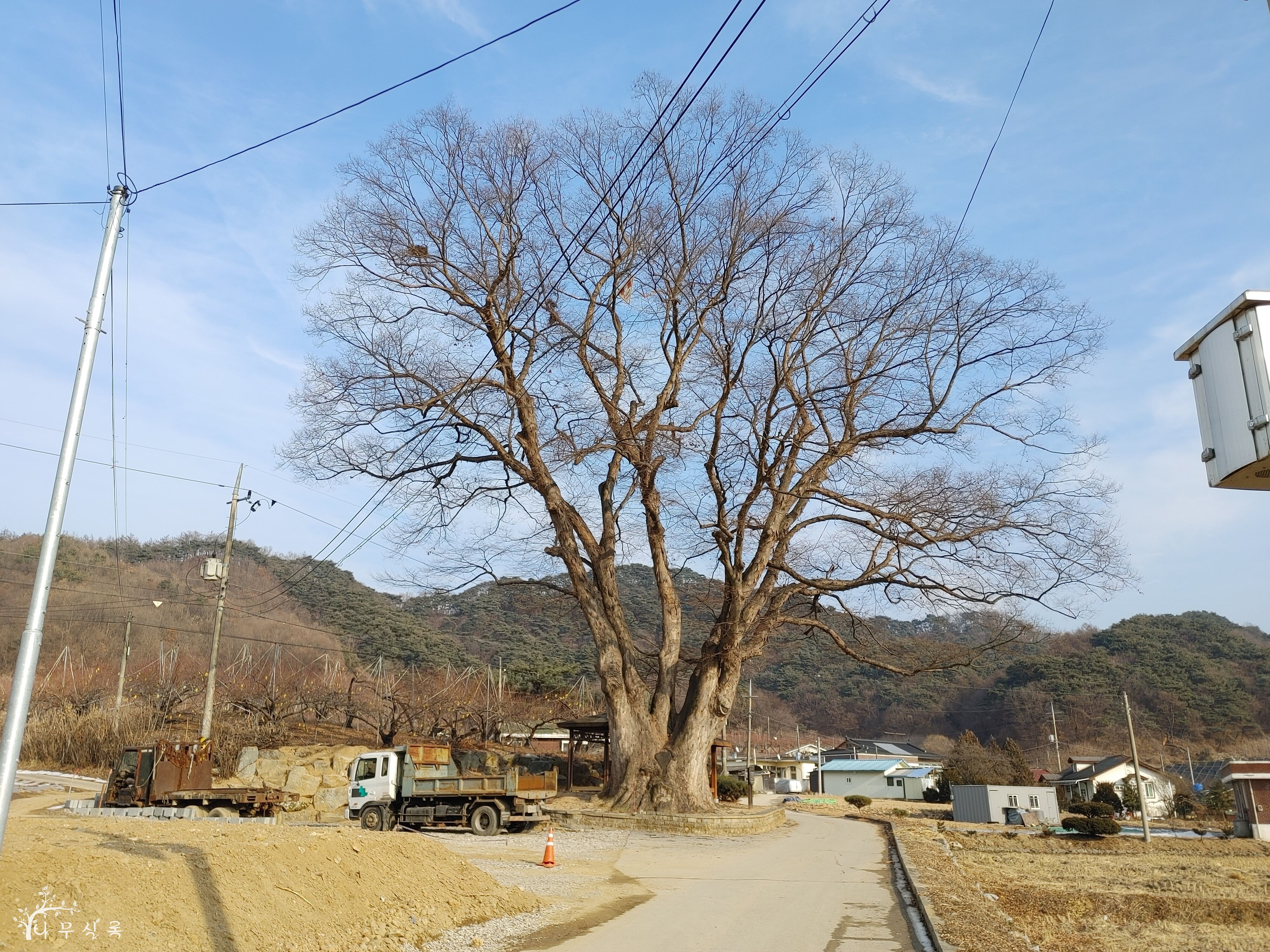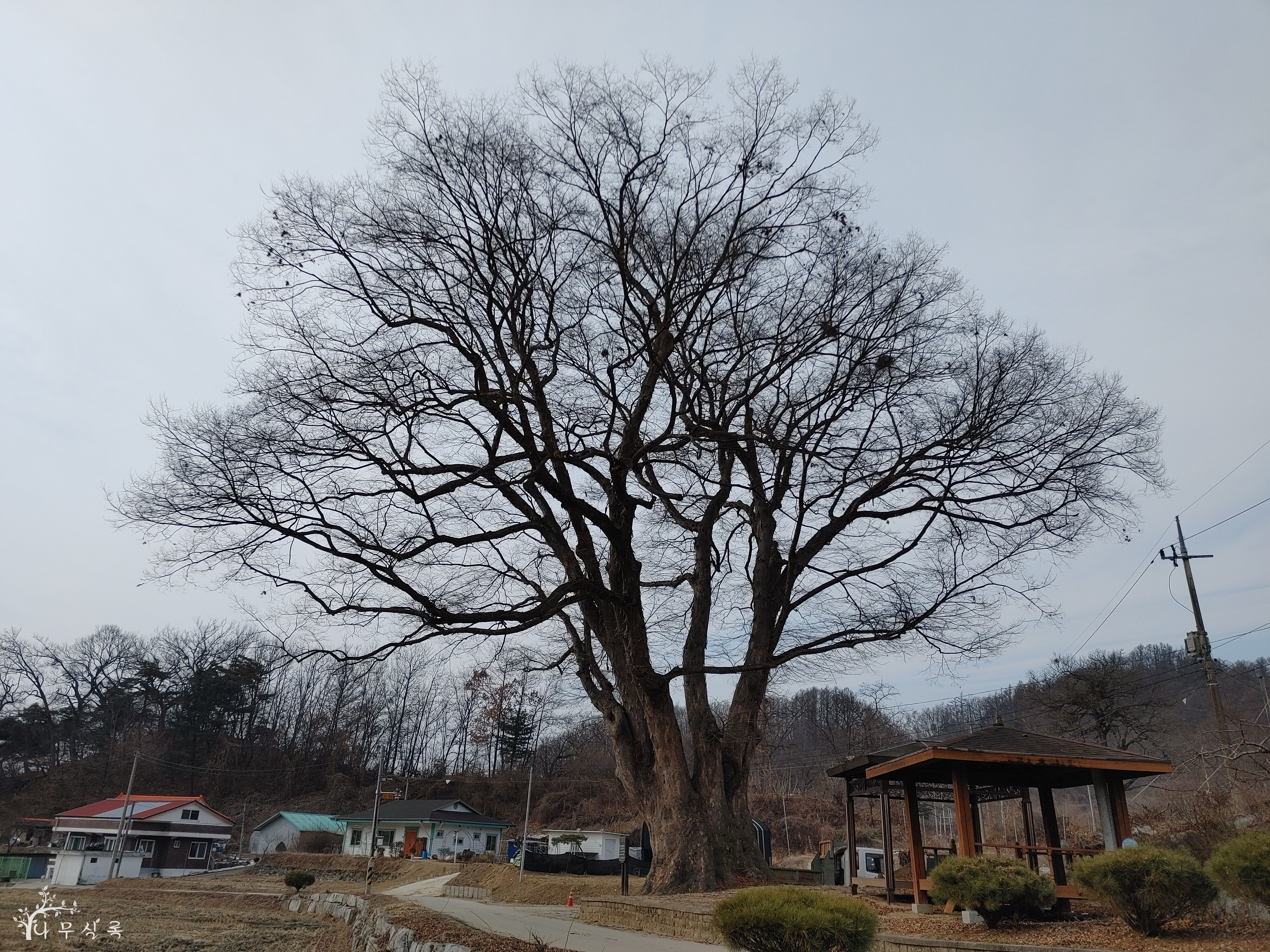 수십 년의 생명을 위해 수백 년의 생명이 자신의 숨결을 끊어 내려는 광경을 목도했습니다. 건물을 짓기 위해 나무의 뿌리를 잘라 내고 가지도 쳐 내서 번듯한 삶터를 만들려고 합니다. 제아무리 사유 재산이 중요하다고는 하지만 40년 넘게 잊고 살았던 권리까지 챙겨줘야 하는지 저로서는 이해하기 어렵습니다. 이러나저러나 지금으로서는 치악산의 산신을 모신 이 마을의 슬레이트 지붕 얹어진 당집에다가 하염없이 기도하는 수밖에요. 목숨이 백척간두에 놓인 이 나무를 특별히 더 지켜봐야겠습니다. 원주시 소초면 교항리 대동마을 소재.