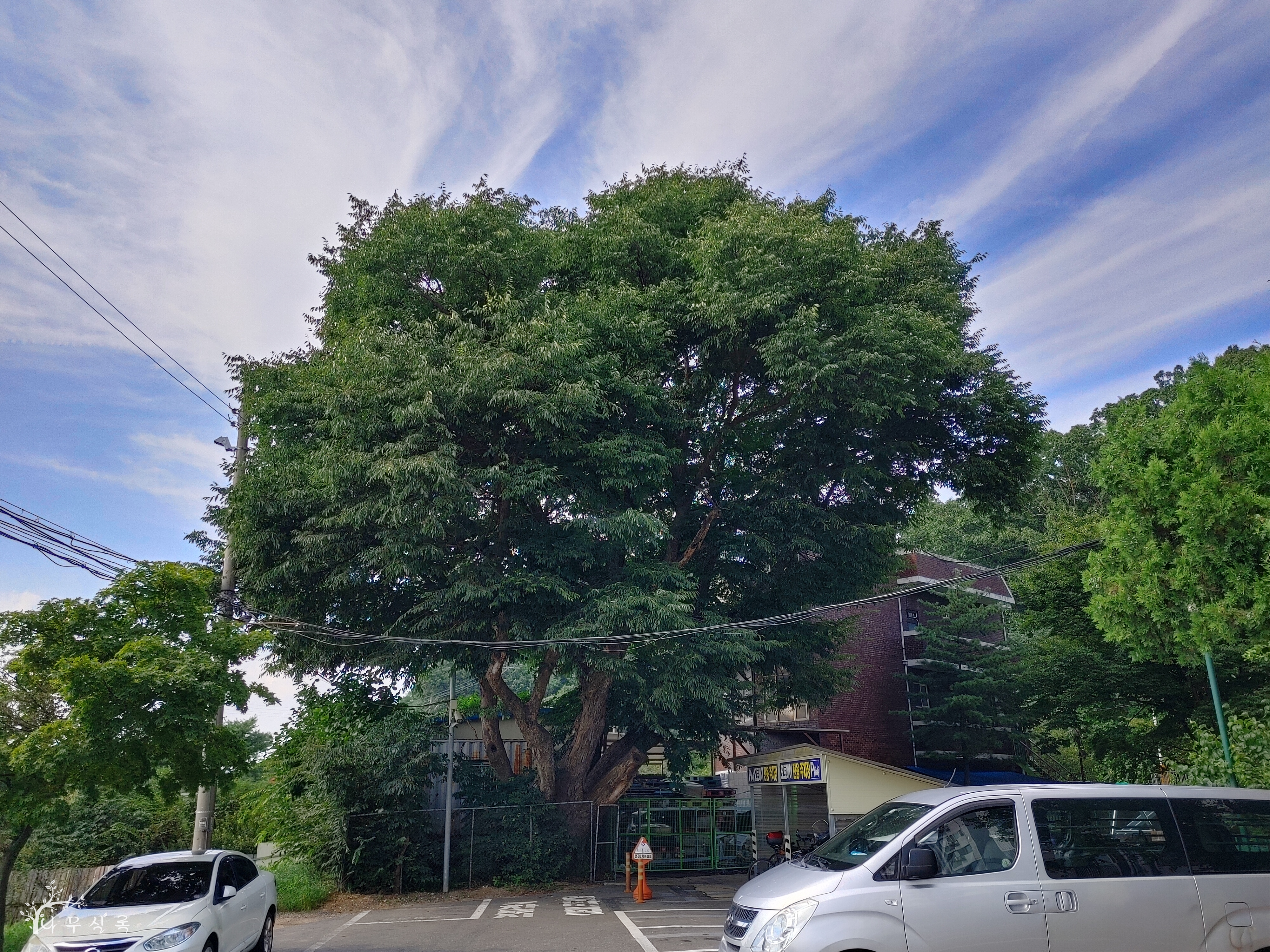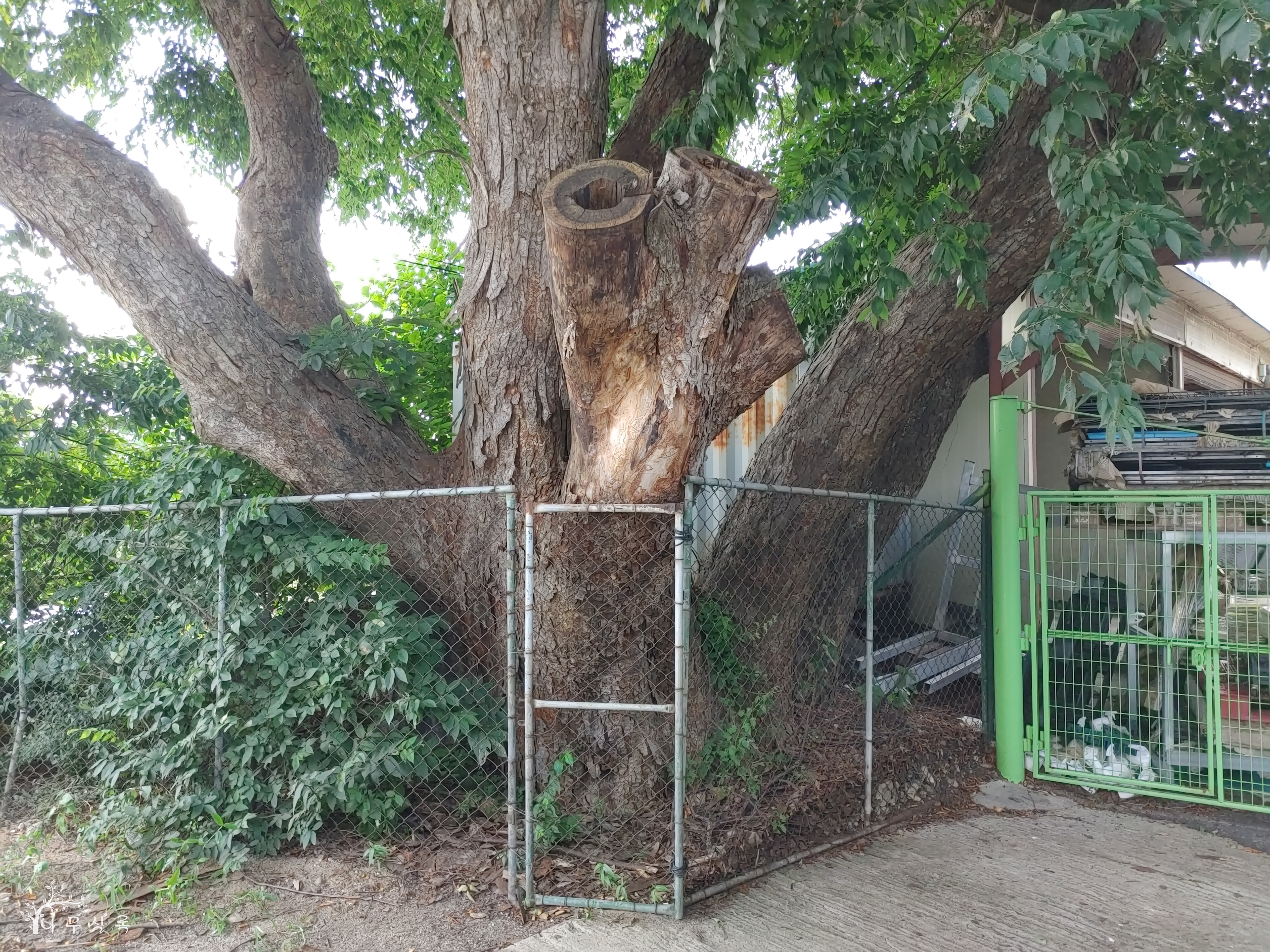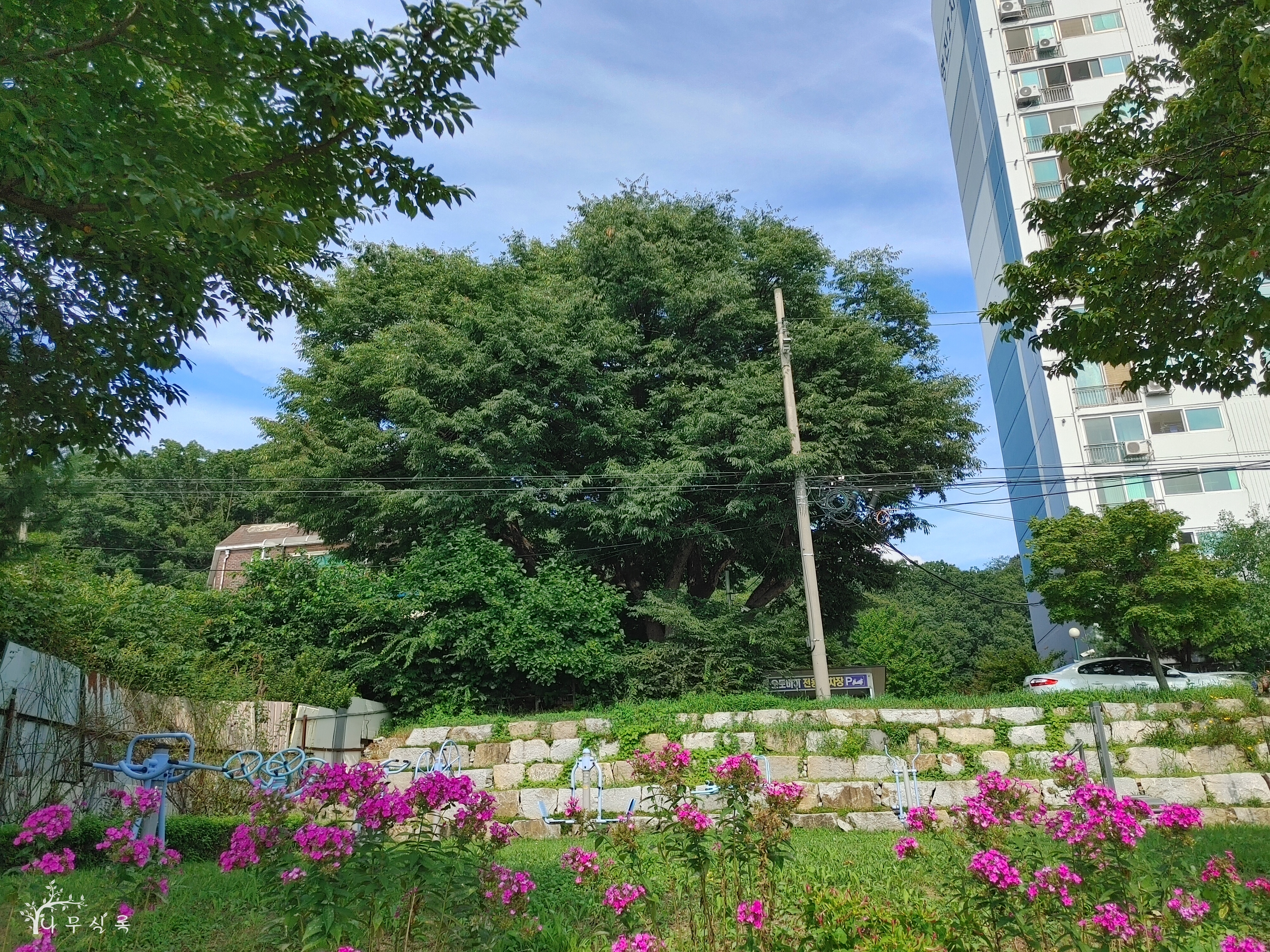 철조망으로 둘러싸인 것으로 보아 아파트 옆 건물 대지에 있는 나무로 추정되지만, 인근에 특징지을 것이 아파트뿐이라 이리 이름지었습니다.